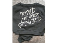 $0 for the first sticker and $0 for each additional sticker proud but never satisfied. Model is 5'11, wearing a size l with a 31 waist, and a 44 chest.